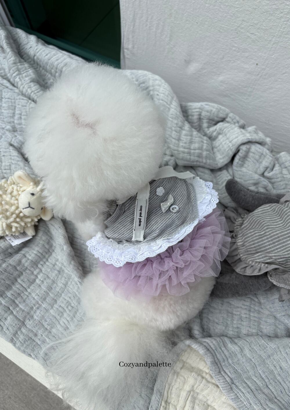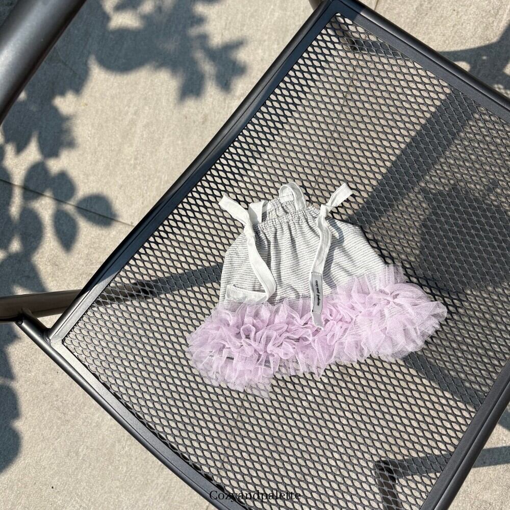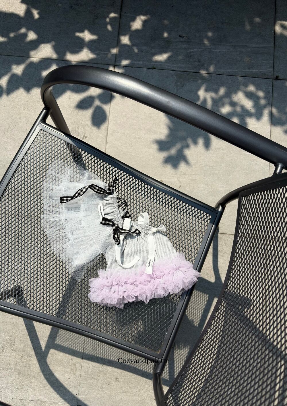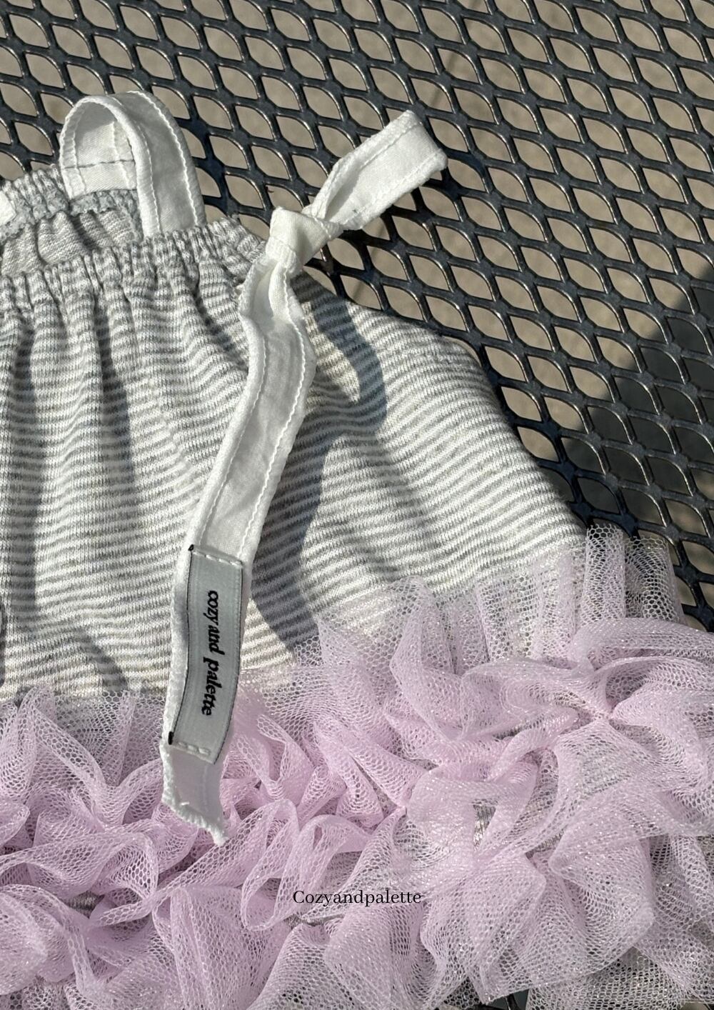 - ライラックメレンゲ:ライトグレーのストライプ柄ボディに、リッチなライラックチュールフリルをあしらったラッフルデザイン