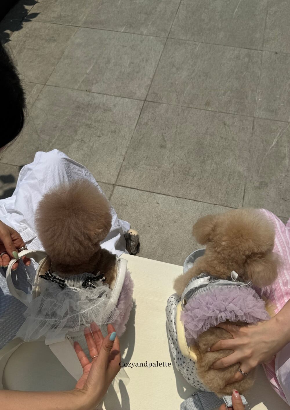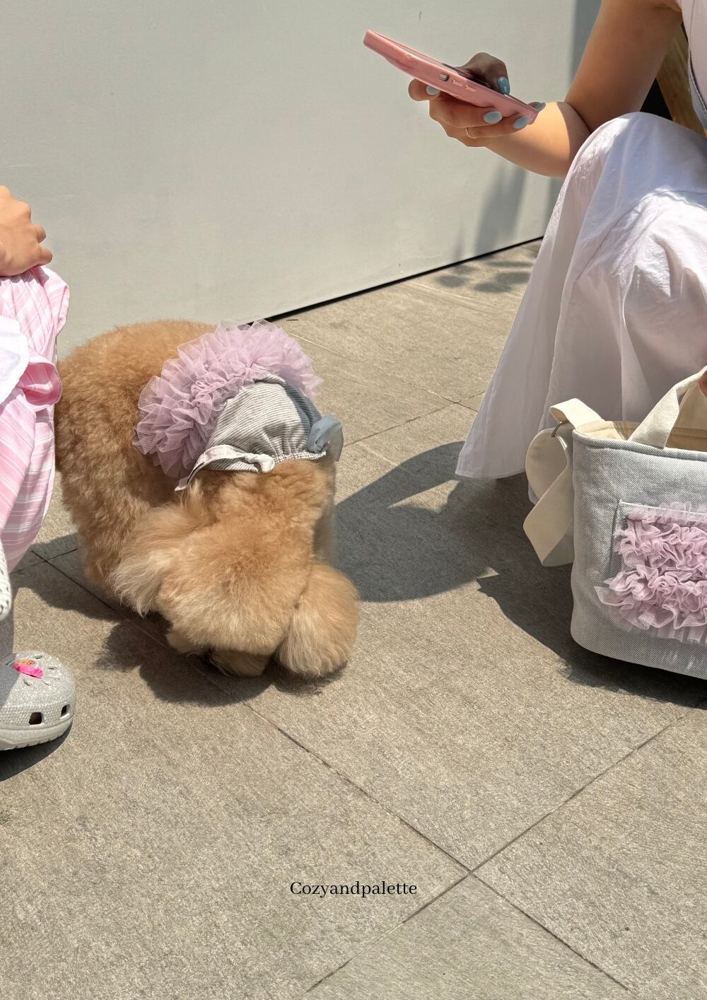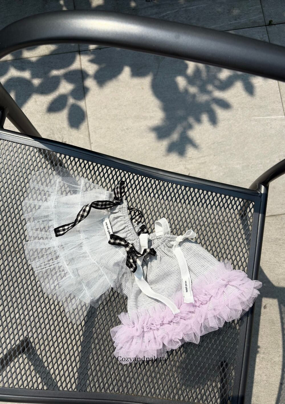 - ライラックメレンゲ:ライトグレーのストライプ柄ボディに、リッチなライラックチュールフリルをあしらったラッフルデザイン