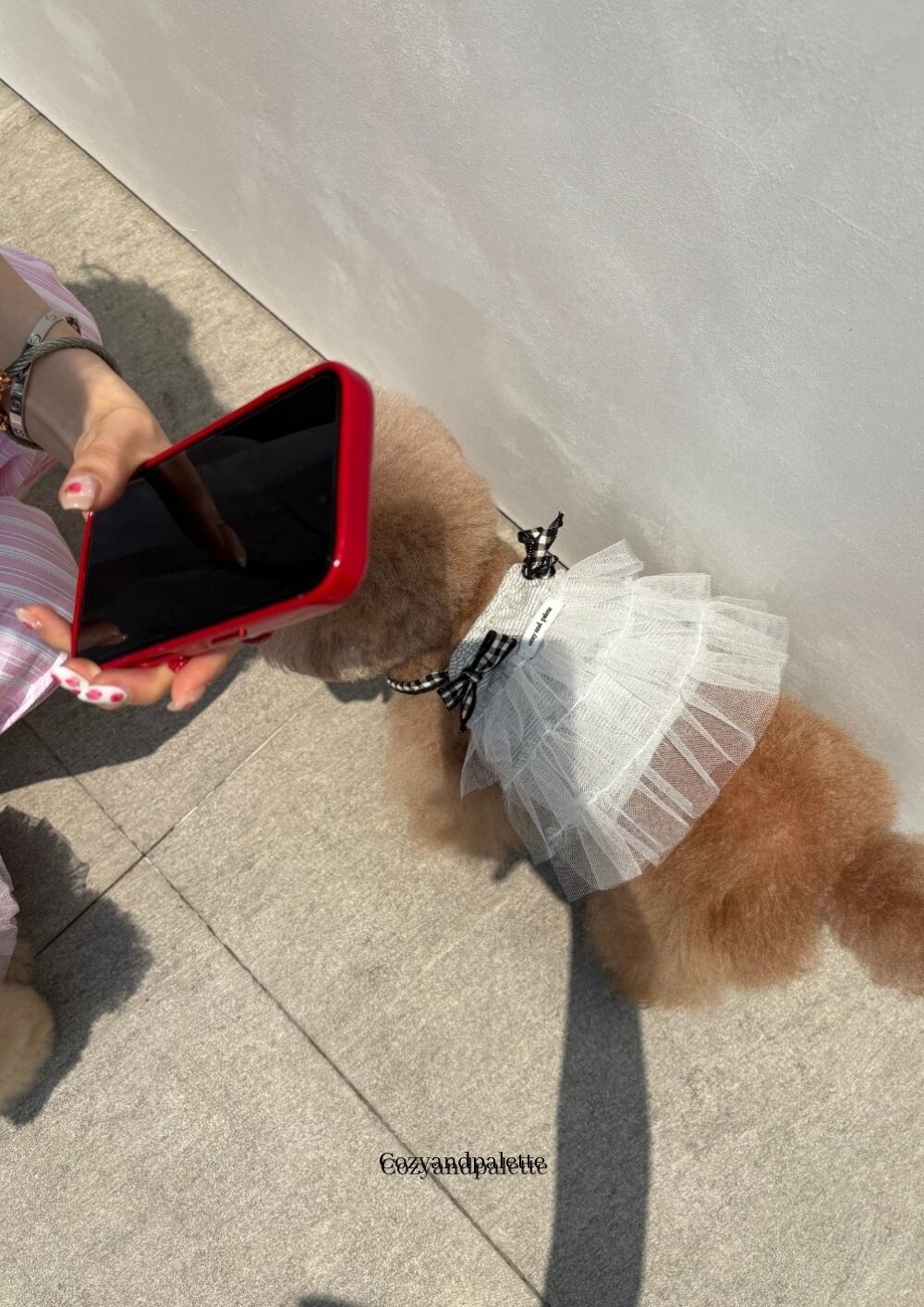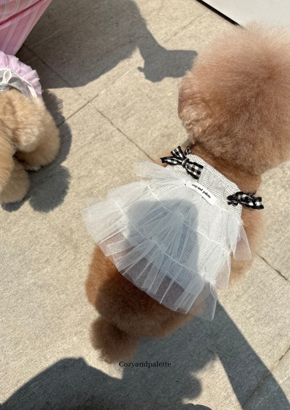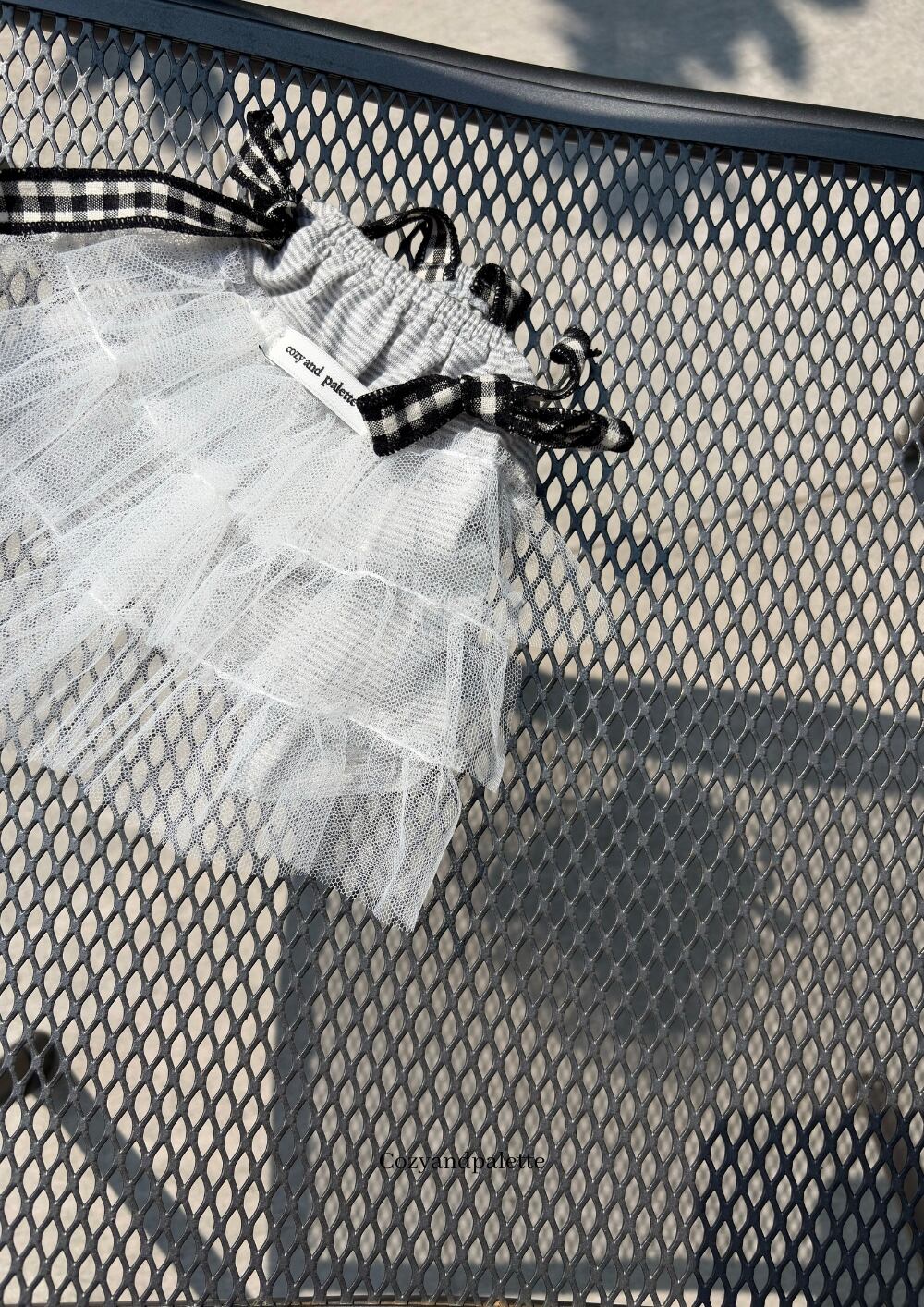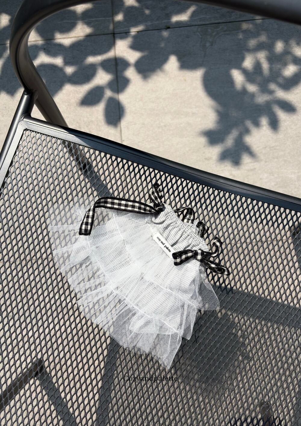 - エアホワイト:チェック柄のリボンストラップをあしらったメッシュのティアードフリルスカートが、キッチュで爽やかな魅力を添えます