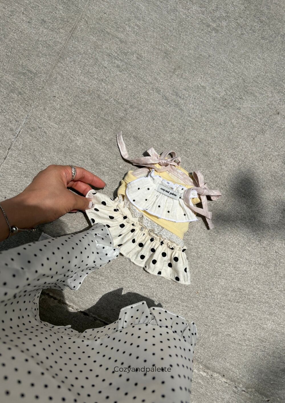 - バストラインやバックラインには、キュートなレースフリル、ミニローズ、ドットリボンなど、異なるディテールをあしらっています。