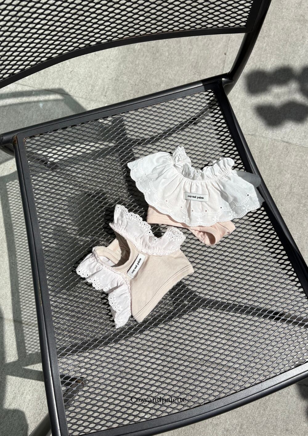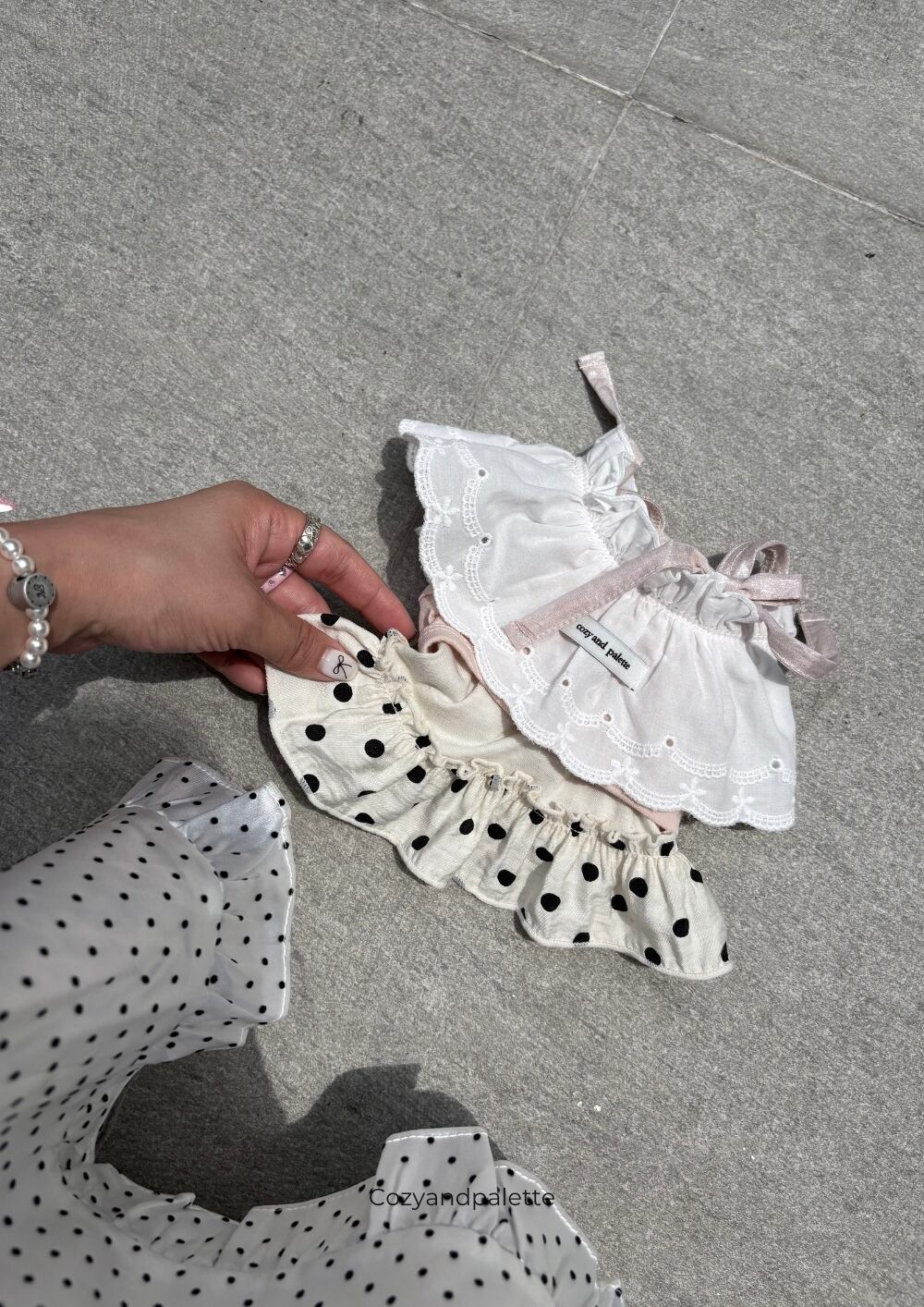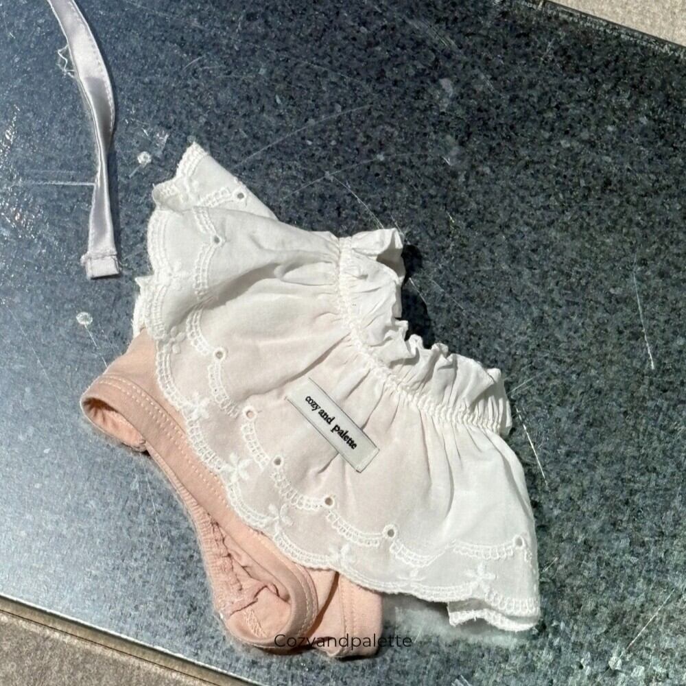 - バストラインやバックラインには、キュートなレースフリル、ミニローズ、ドットリボンなど、異なるディテールをあしらっています。
