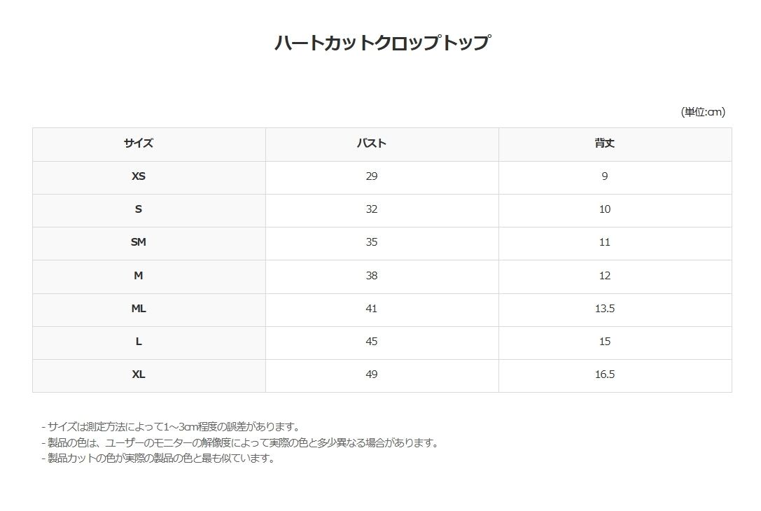 - ハートカットのクロップド丈はアームホールが深く幅広のため、少し大きめのサイズでもアームホール部分がゆるくなる場合があります