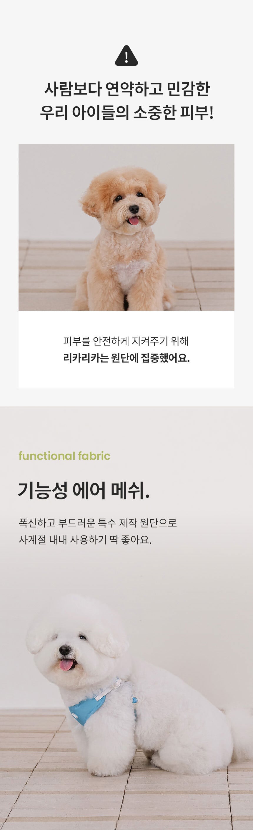 自社のハーネスは、肌が擦れたり、毛が挟まらないよう縫製方式を外向きに変更し、精巧に仕上げ処理しました