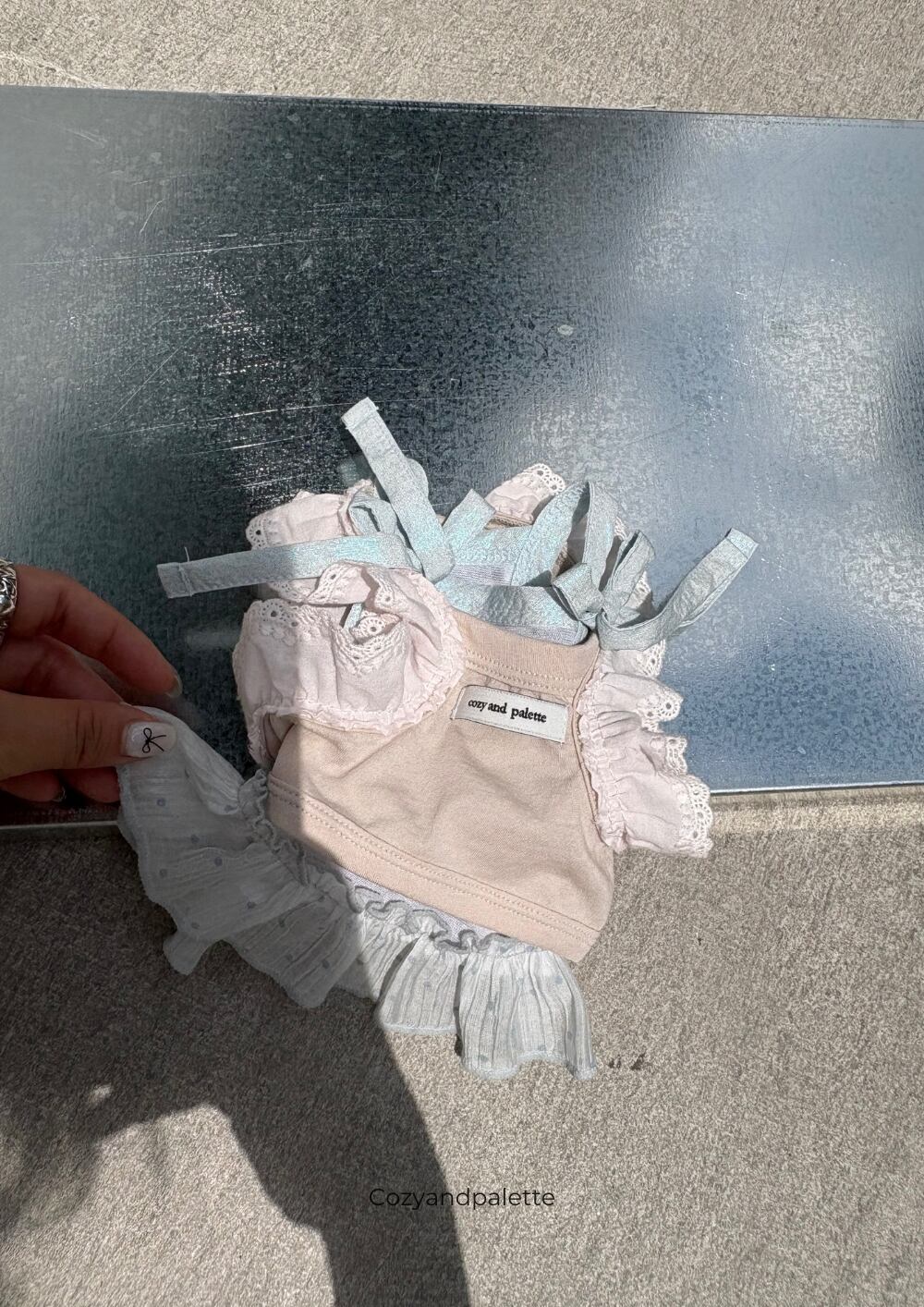 – リボンのショルダーストラップとボリュームのあるフリルスカートが美しいシルエット。