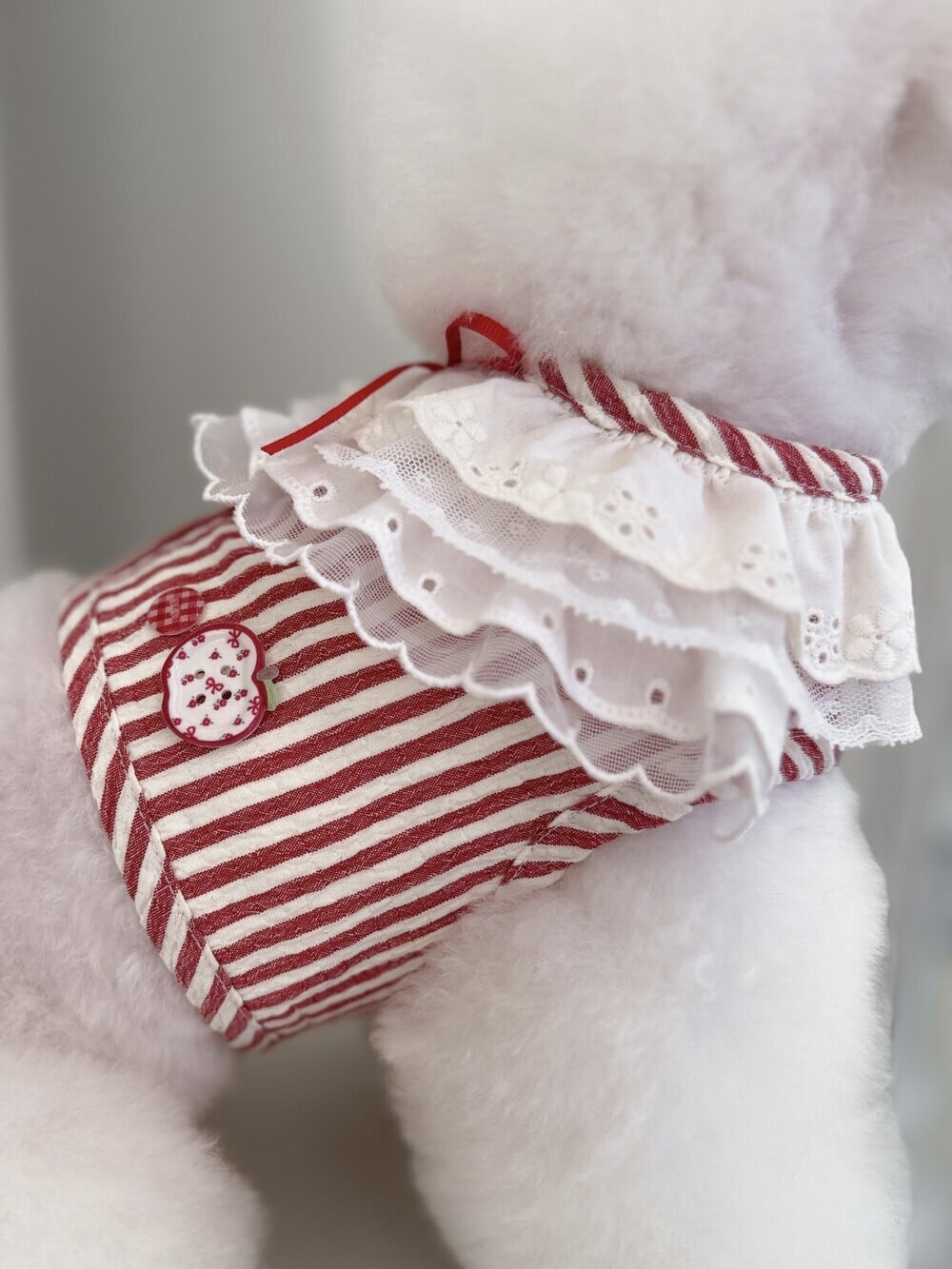 レッドストライプパターンとかわいいリンゴボタンで爽やかなポイントを加え、