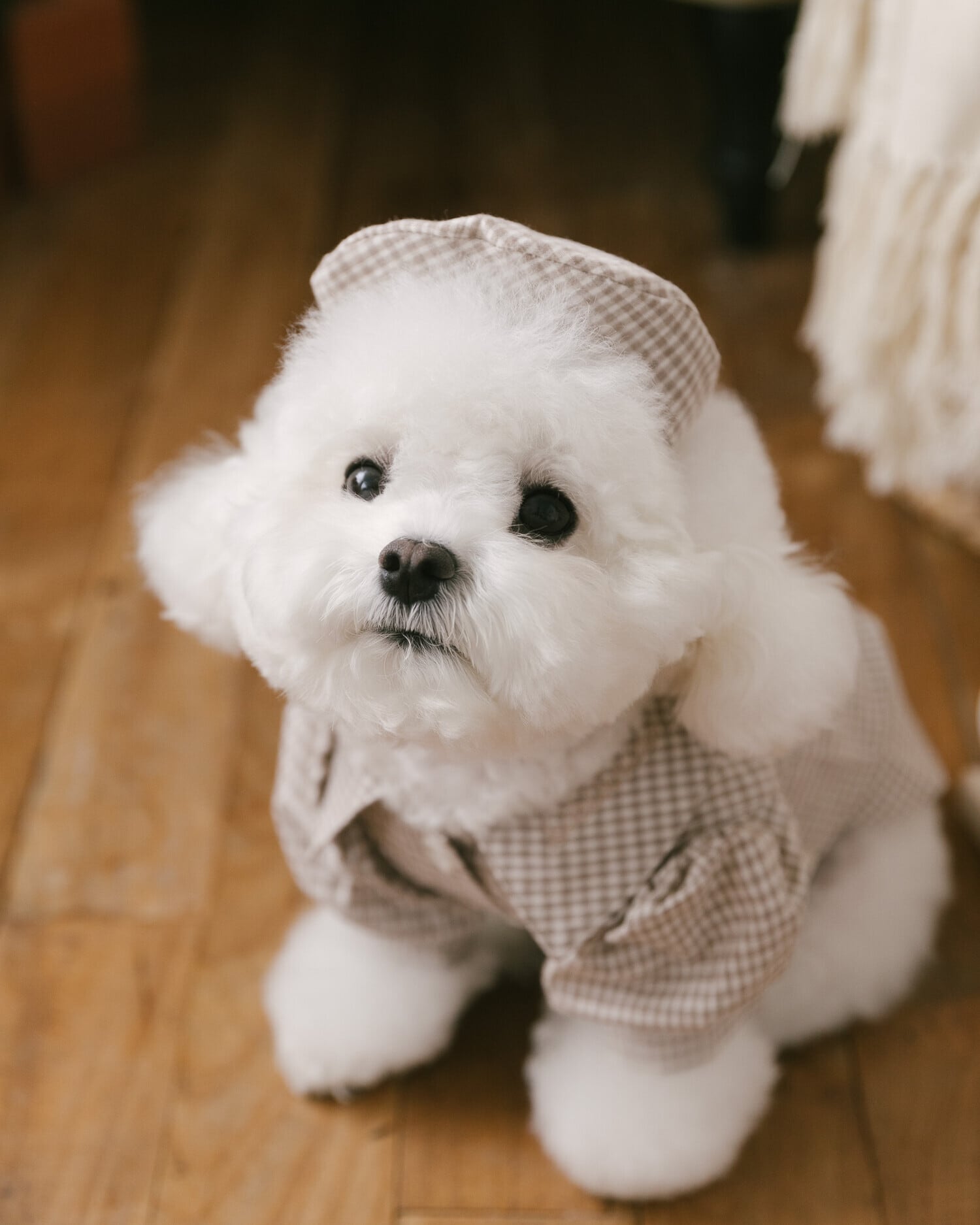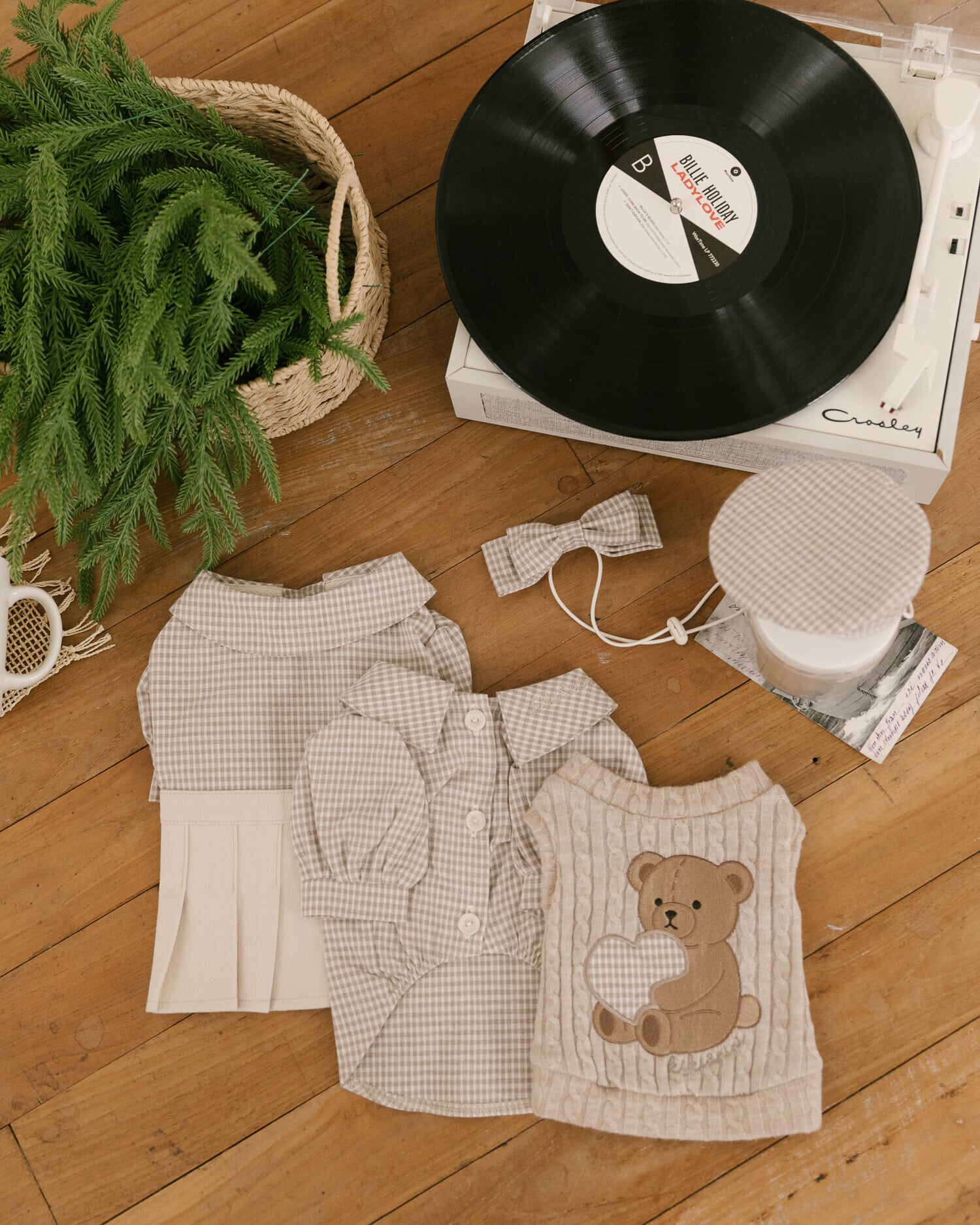 ニットベスト、シャツ、シャツワンピース、ベレー帽、リボンヘアバンドは別売りです。