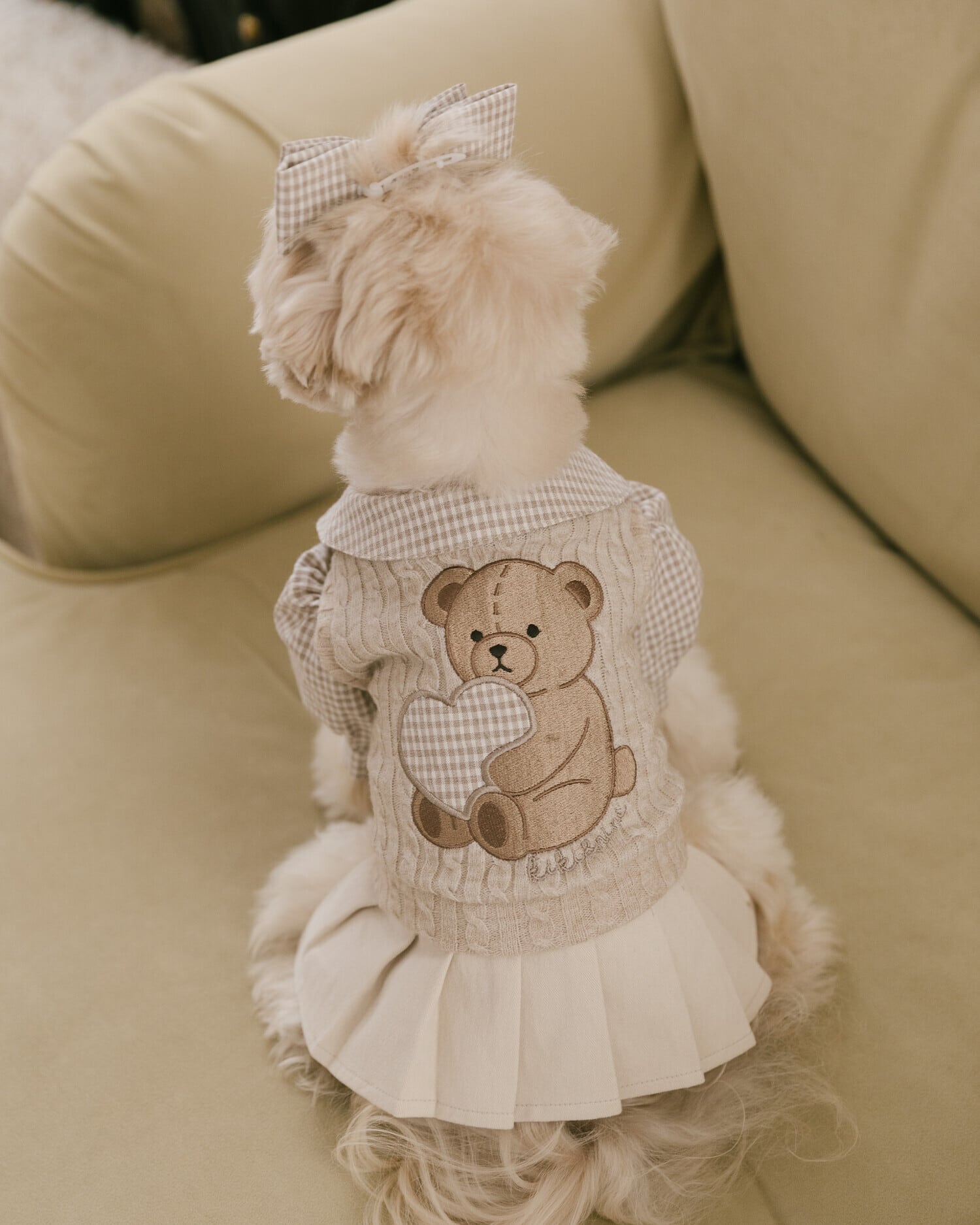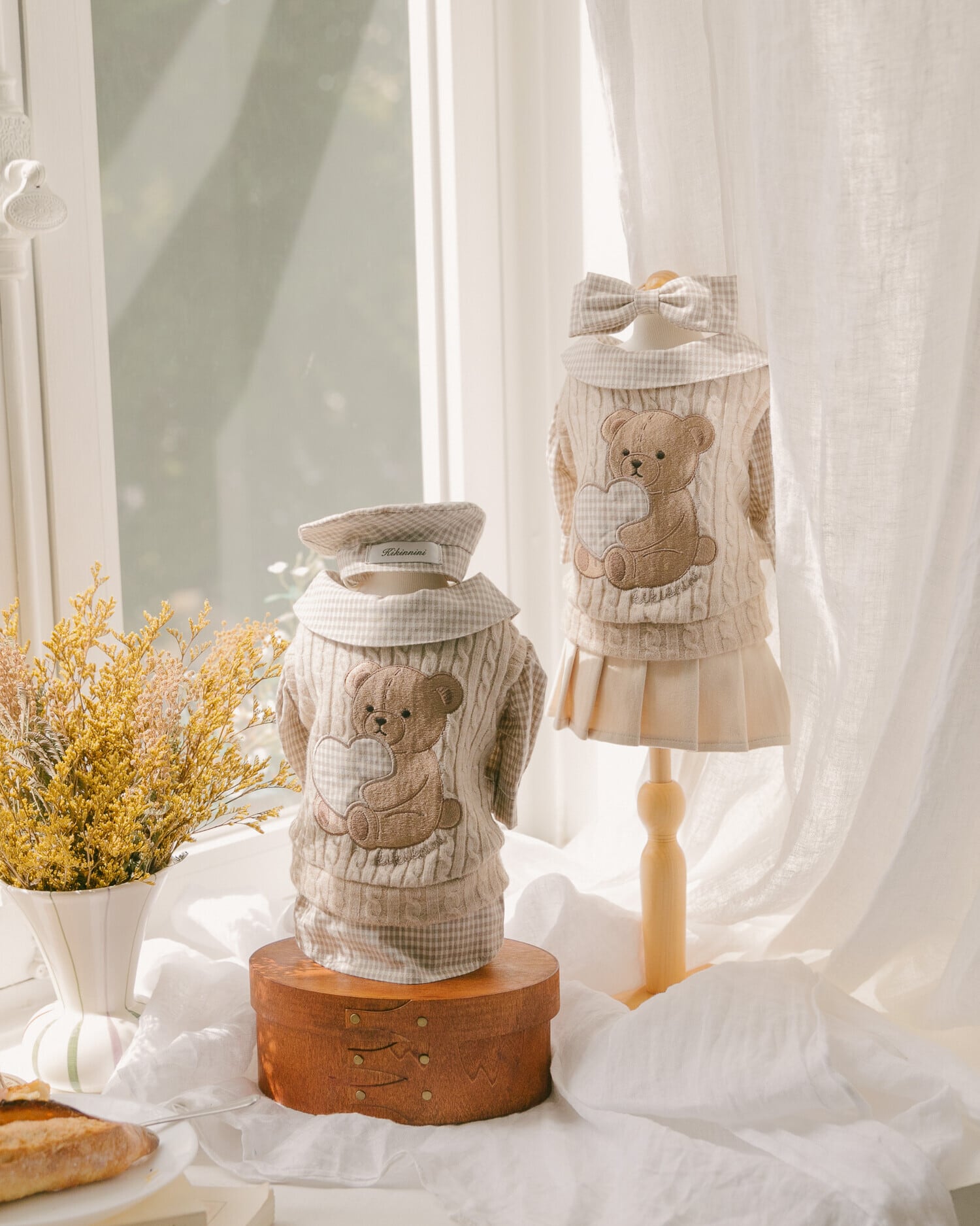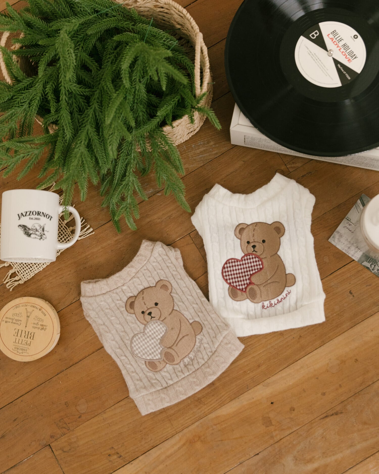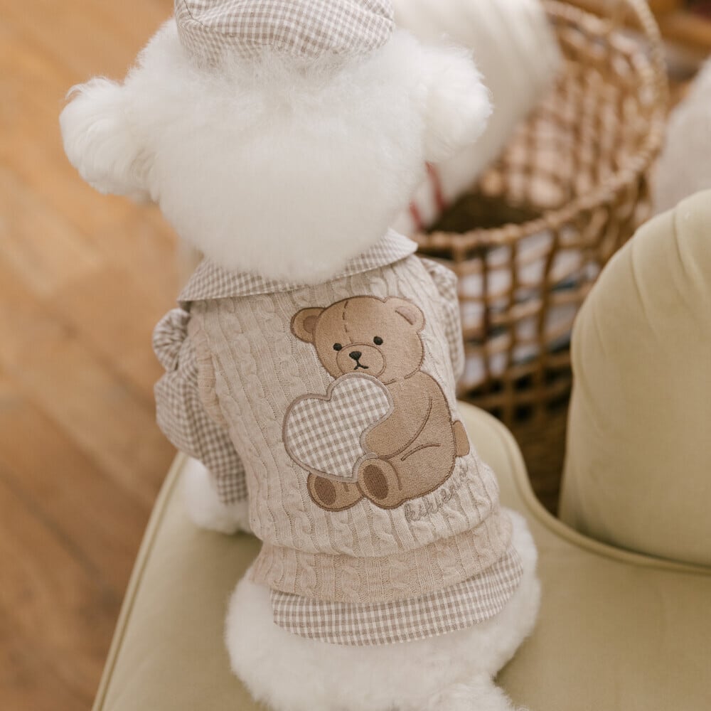 温かみのあるテディベアの刺繍とハートのアップリケが施され、