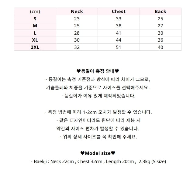 ・Baekji: Neck 22cm, Chest 32cm, Length 20cm, 2.3kg (S size)