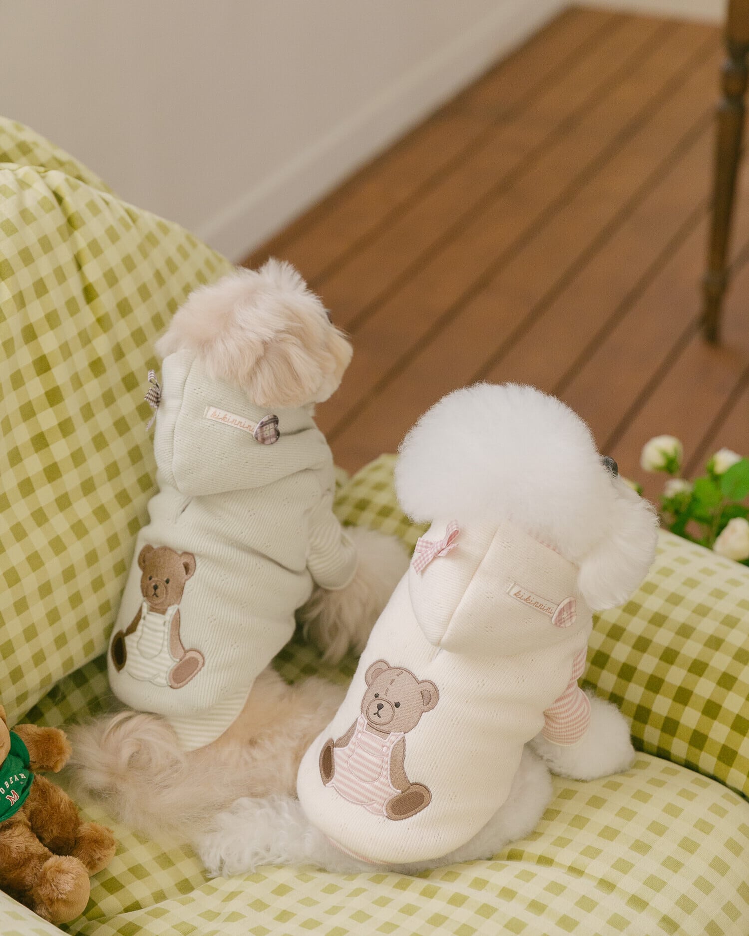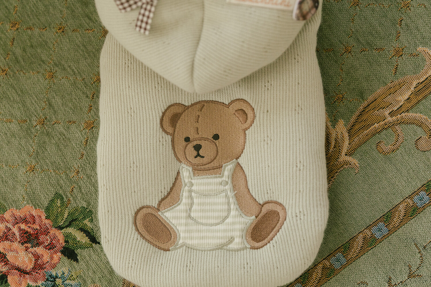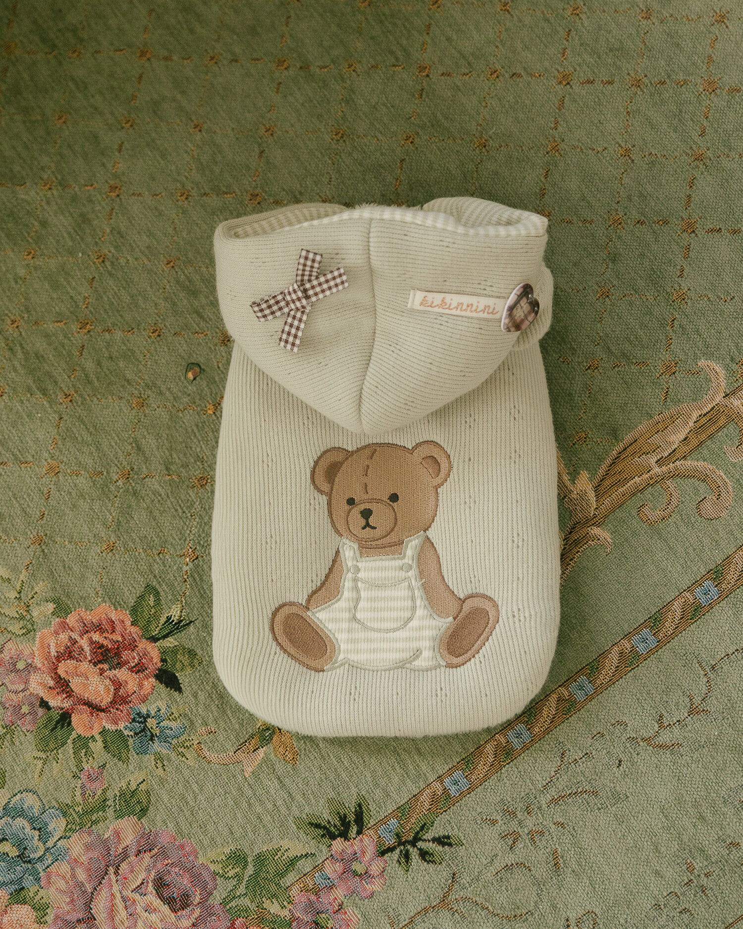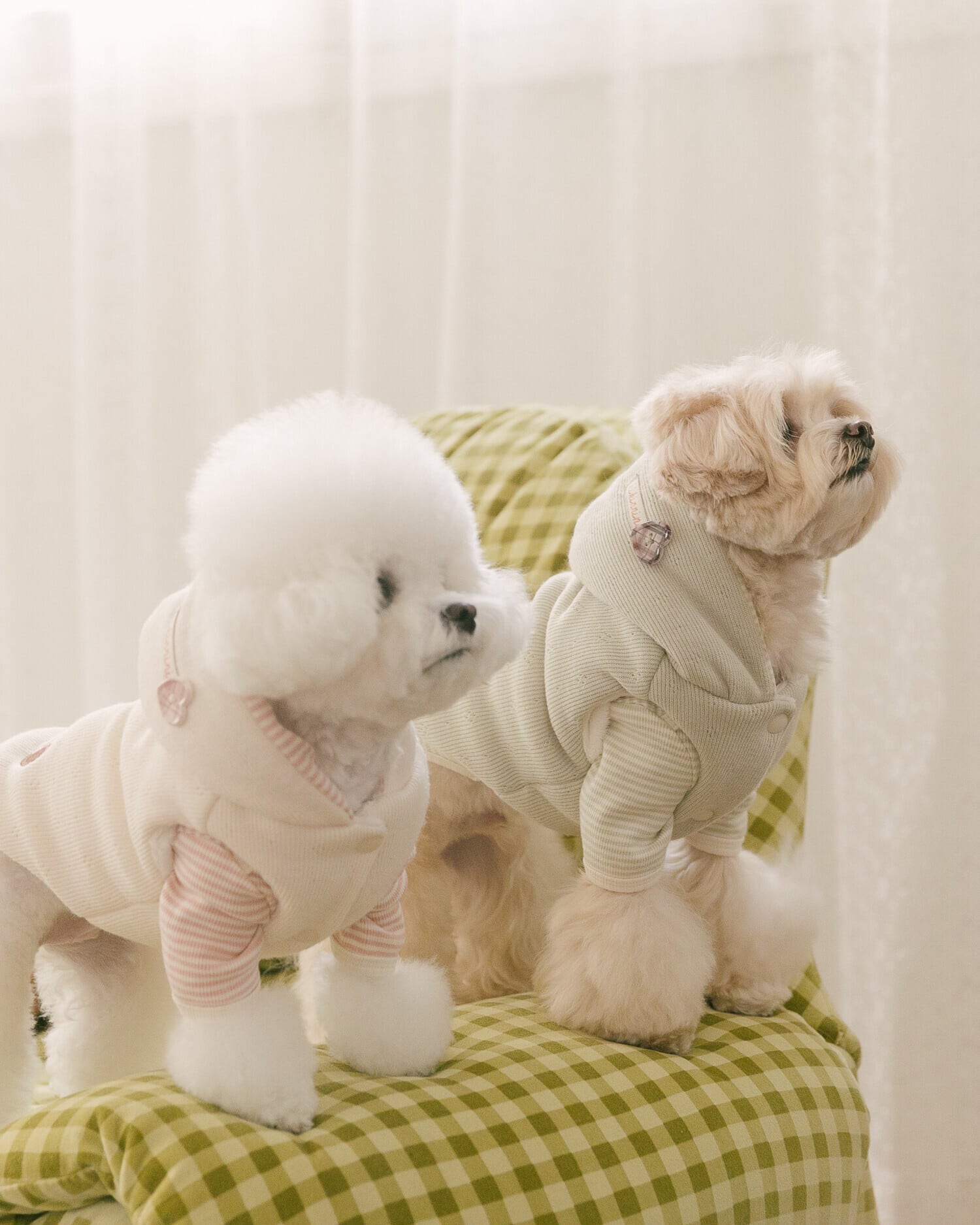 フードにはギンガムチェックのリボンとハートボタンがあしらわれ、
