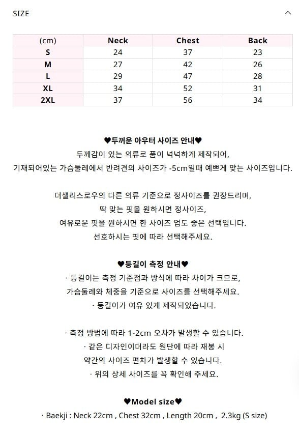 ㆍBaekji : Neck 22cm , Chest 32cm , Length 20cm , 2.3kg (S size)