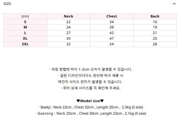 ㆍBaekji : Neck 22cm, Chest 32cm , Length 20cm , 2.3kg (S size)