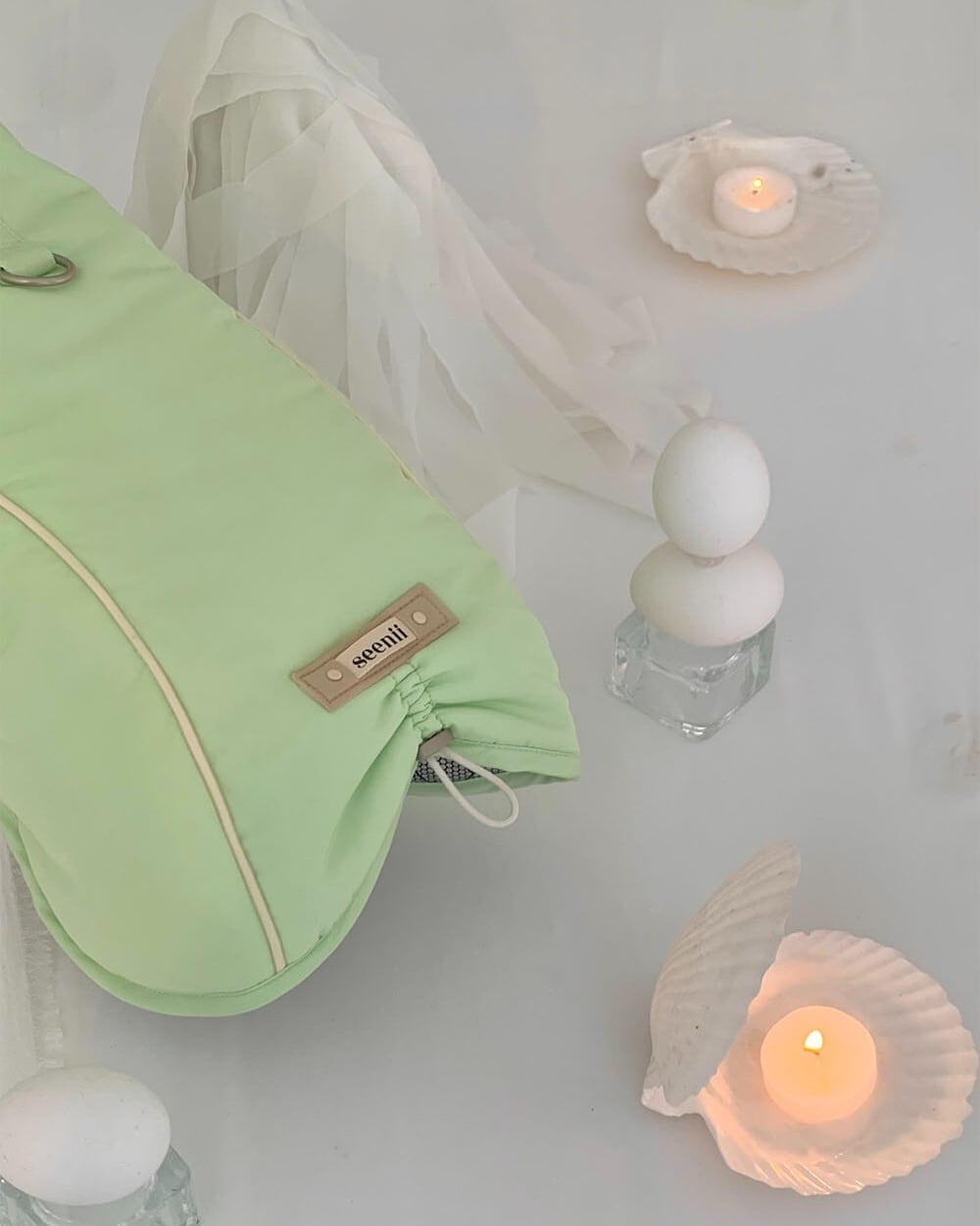 生地を傷めて変形させる可能性があるため、洗濯機、乾燥機などの機械洗濯の使用を絶対禁止します。