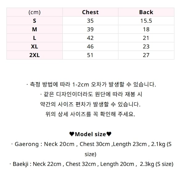ㆍGaerong : Neck 20cm , Chest 30cm ,Length 23cm , 2.1kg (S size)