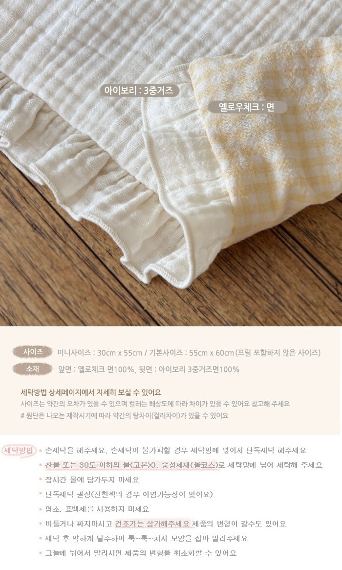 長時間水に浸さないでください 単独洗濯を推奨します(濃い色の場合、色移りの可能性があります) 塩素、漂白剤を使用しないでください ねじったり絞ったりしないで、乾燥機はご遠慮ください。
