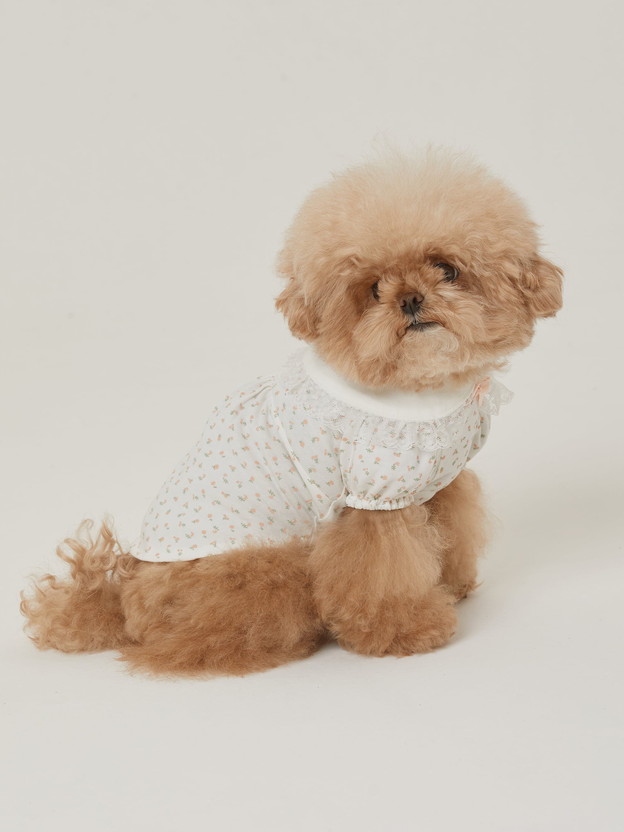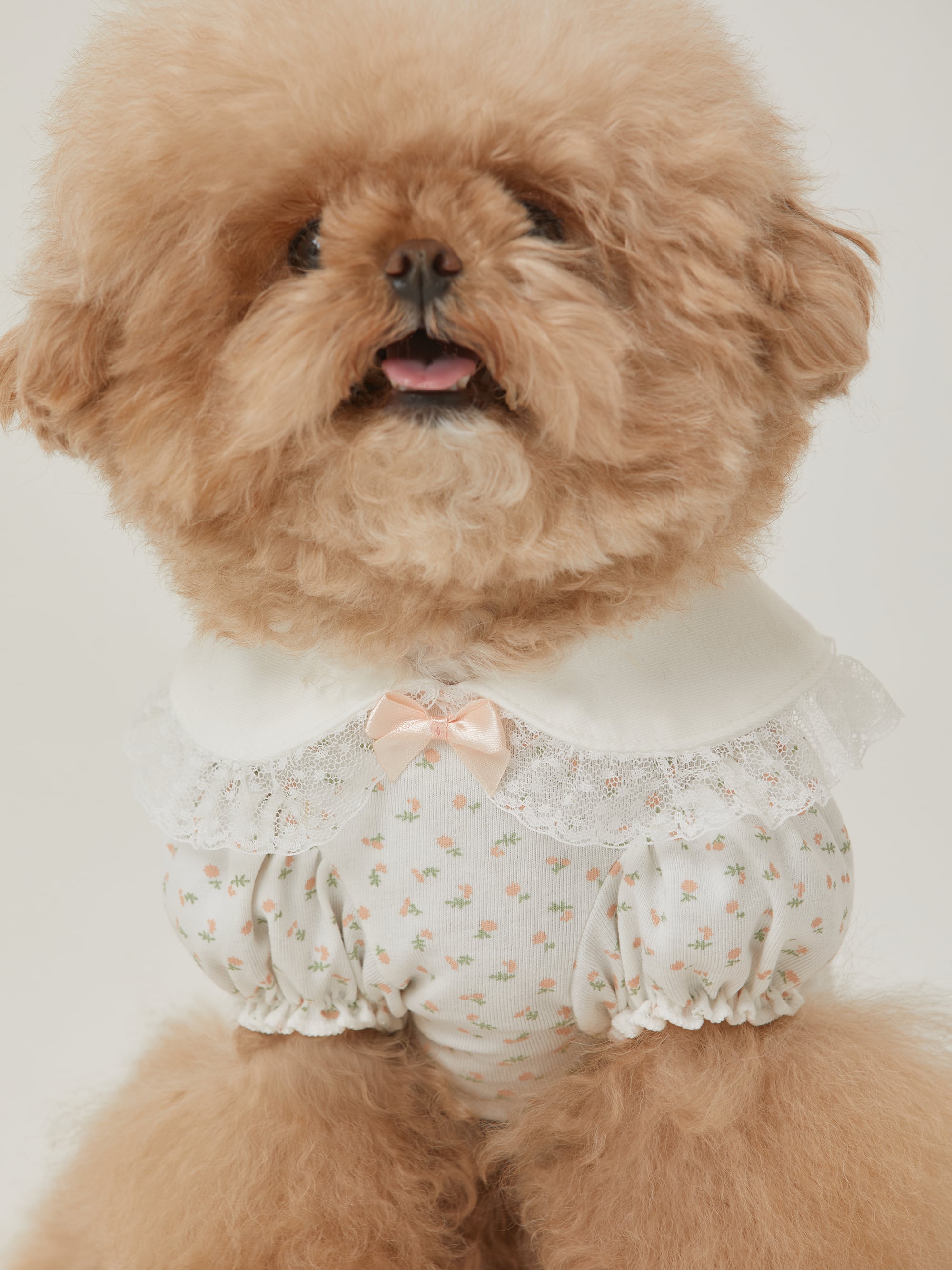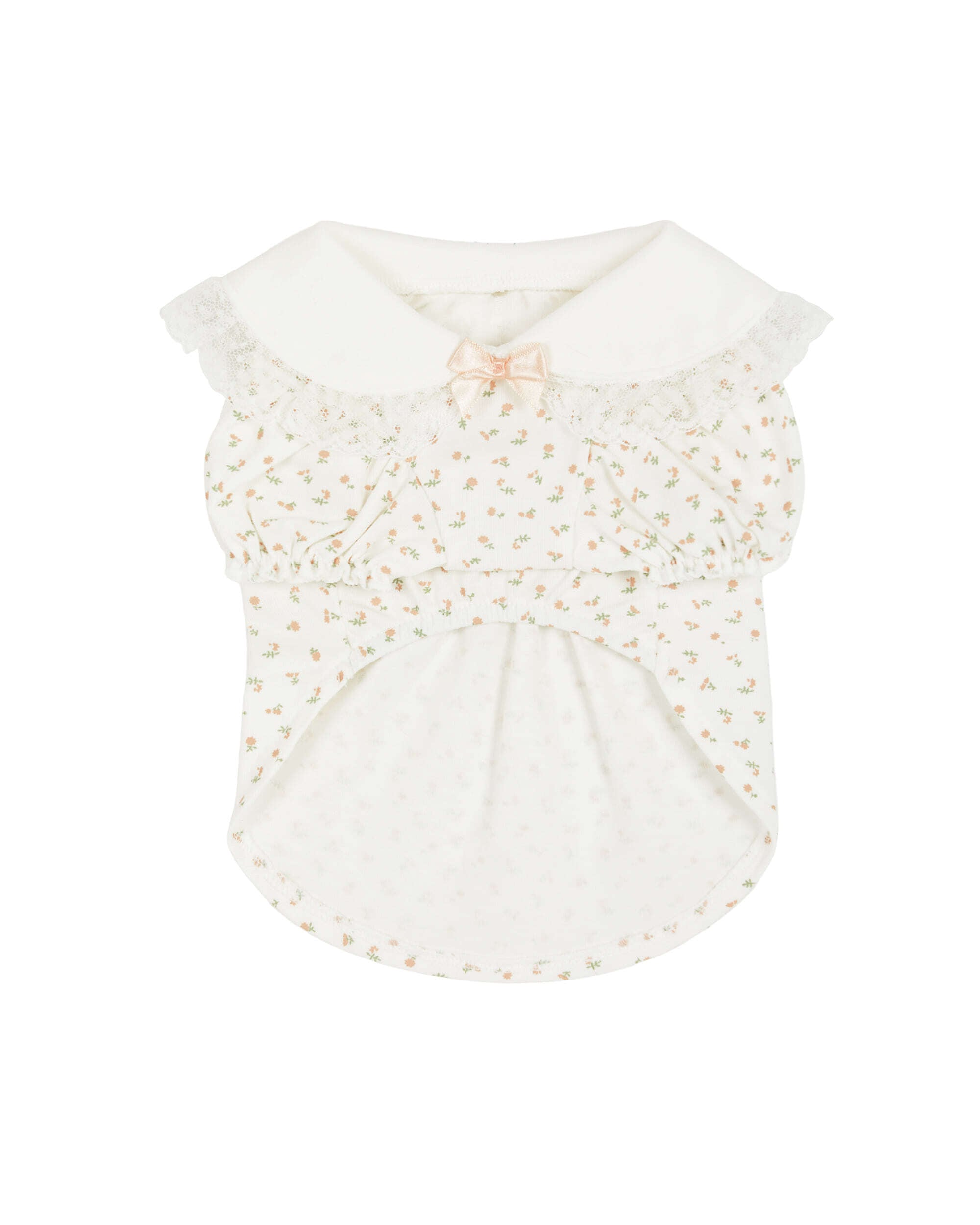 ㆍアプリコットカラーの花柄と純白のネックカラーのカラーブロッキングディテール