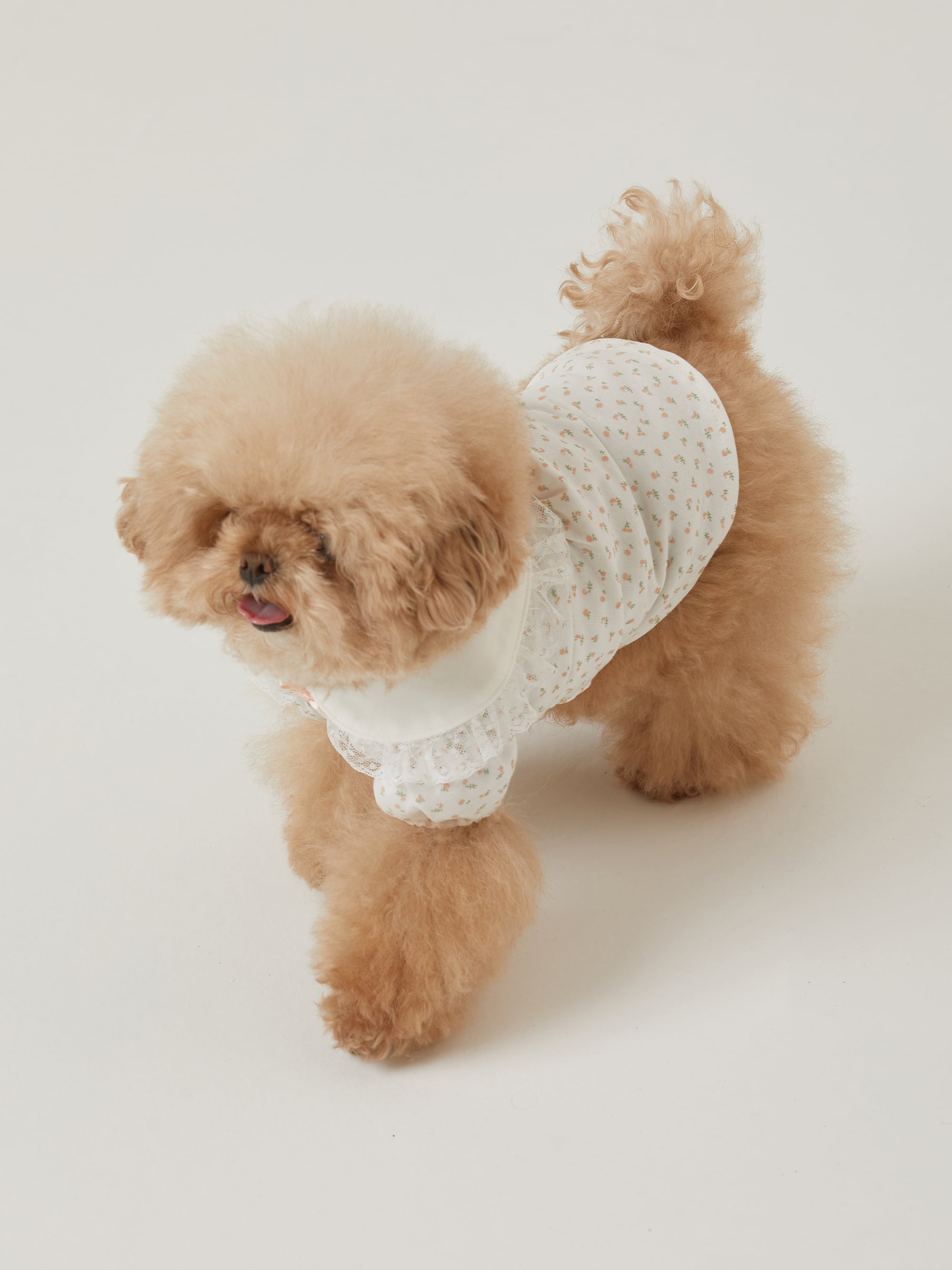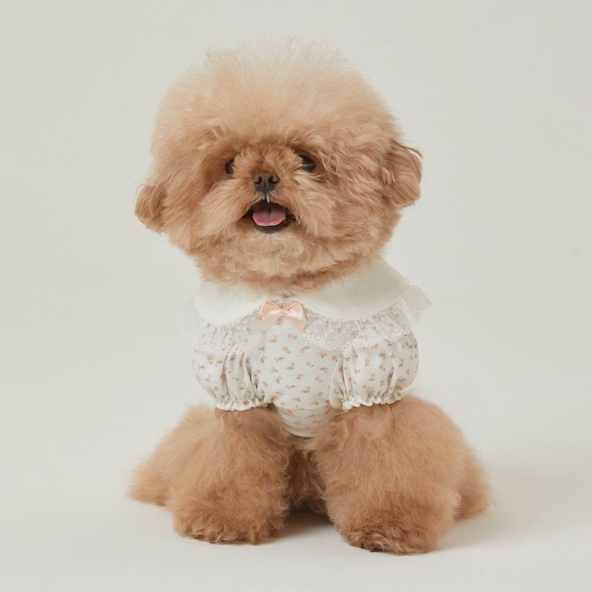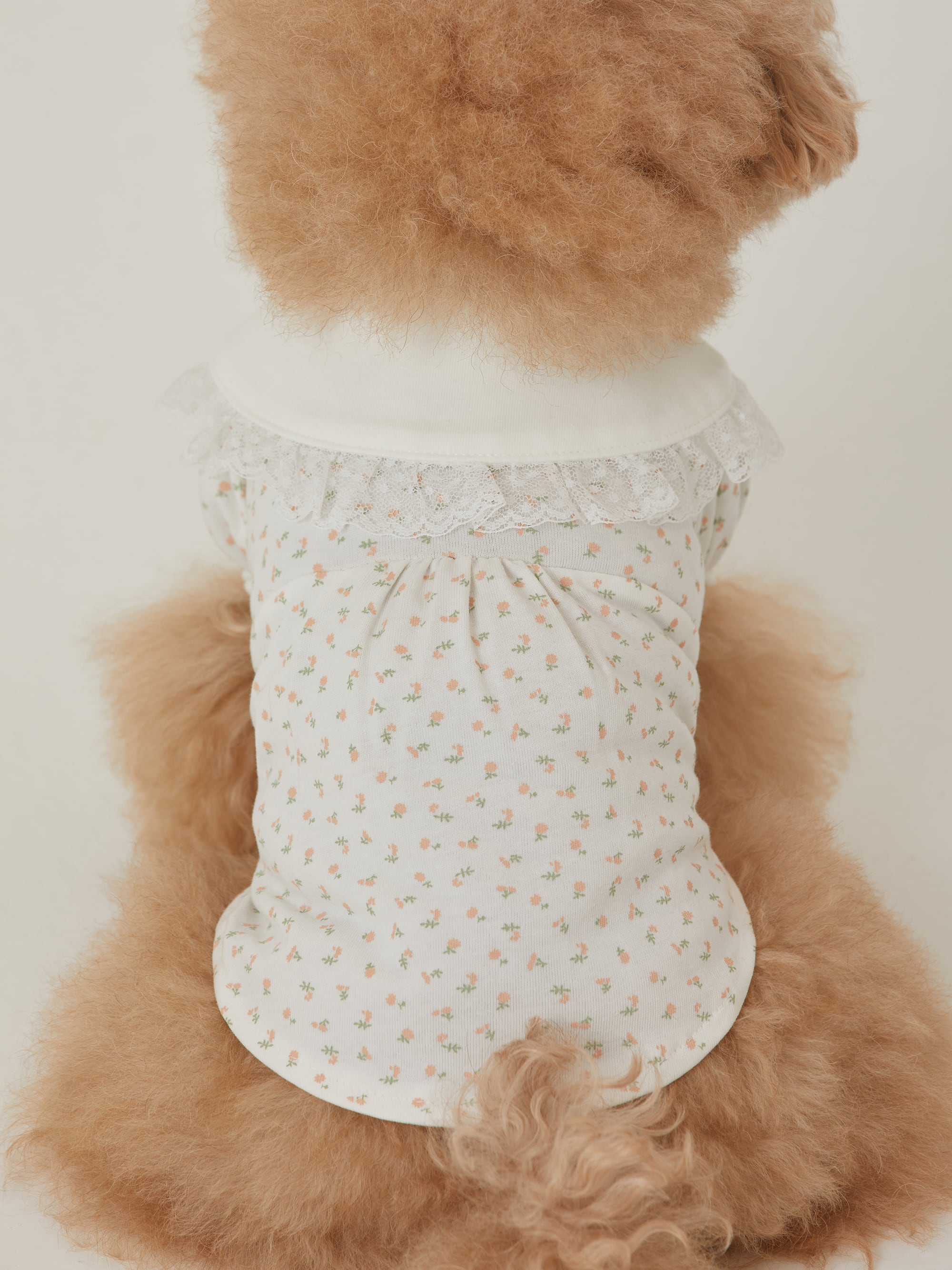 ㆍアプリコットカラーの花柄と純白のネックカラーのカラーブロッキングディテール