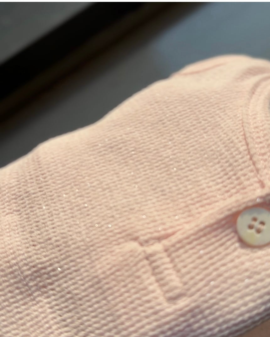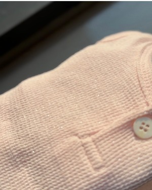 シルバーパール糸を繊細に織り込んだ生地を使用し、柔らかく軽やかな着心地で、一枚で着ても素敵です。重ね着にも最適です。