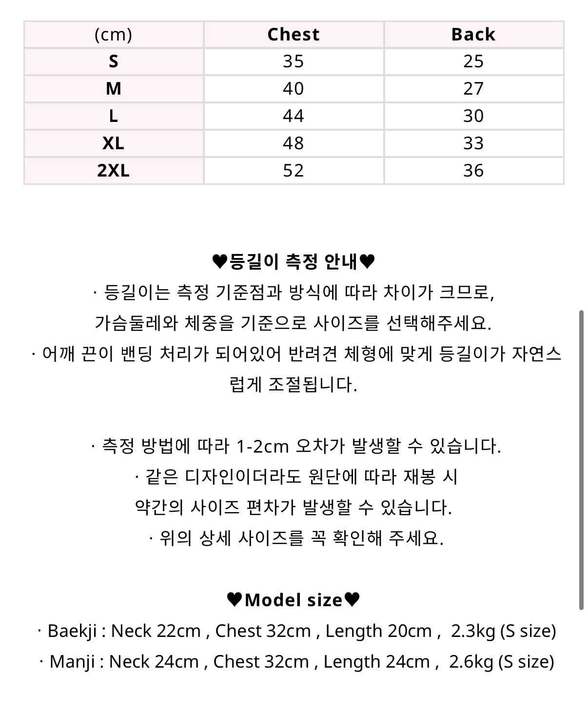 ㆍBaekji : Neck 22cm , Chest 32cm , Length 20cm , 2.3kg (S size)