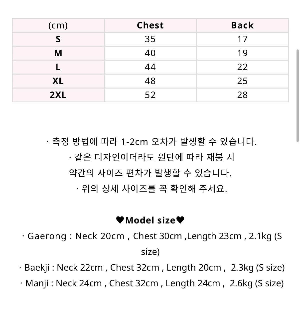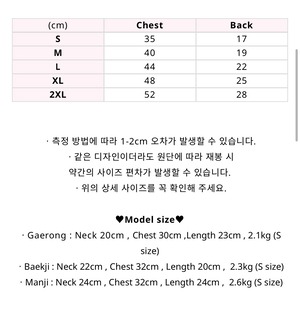 ㆍBaekji : Neck 22cm , Chest 32cm , Length 20cm , 2.3kg (S size)