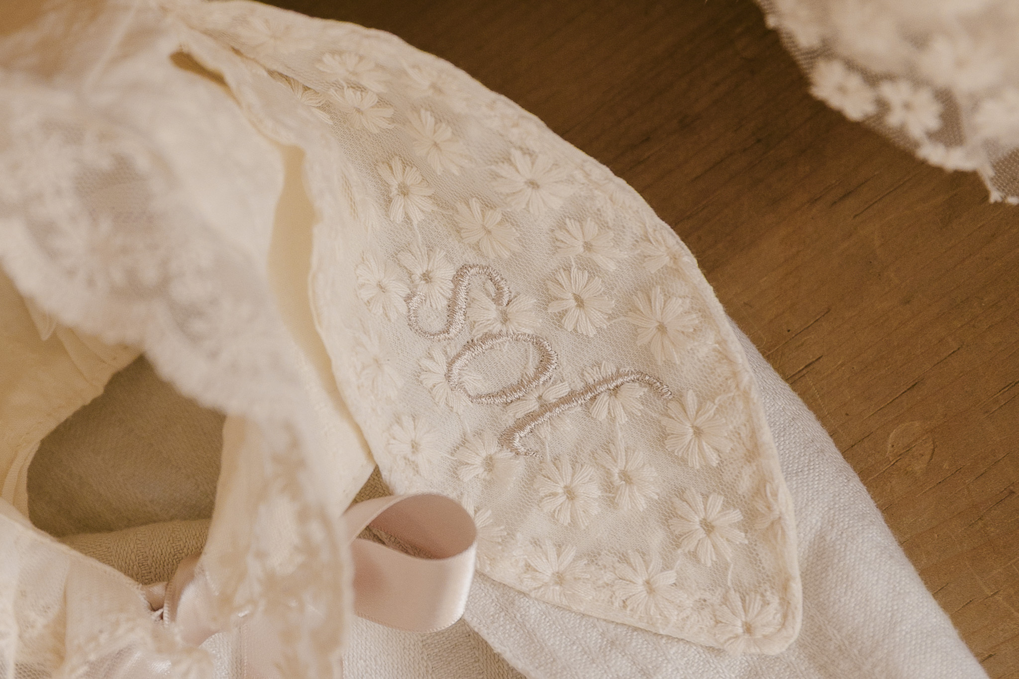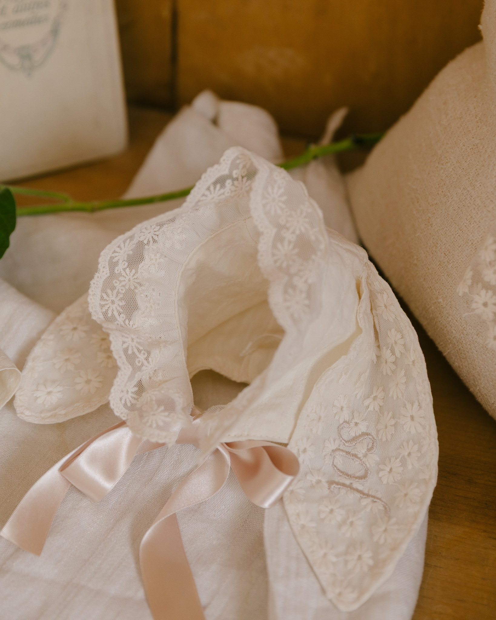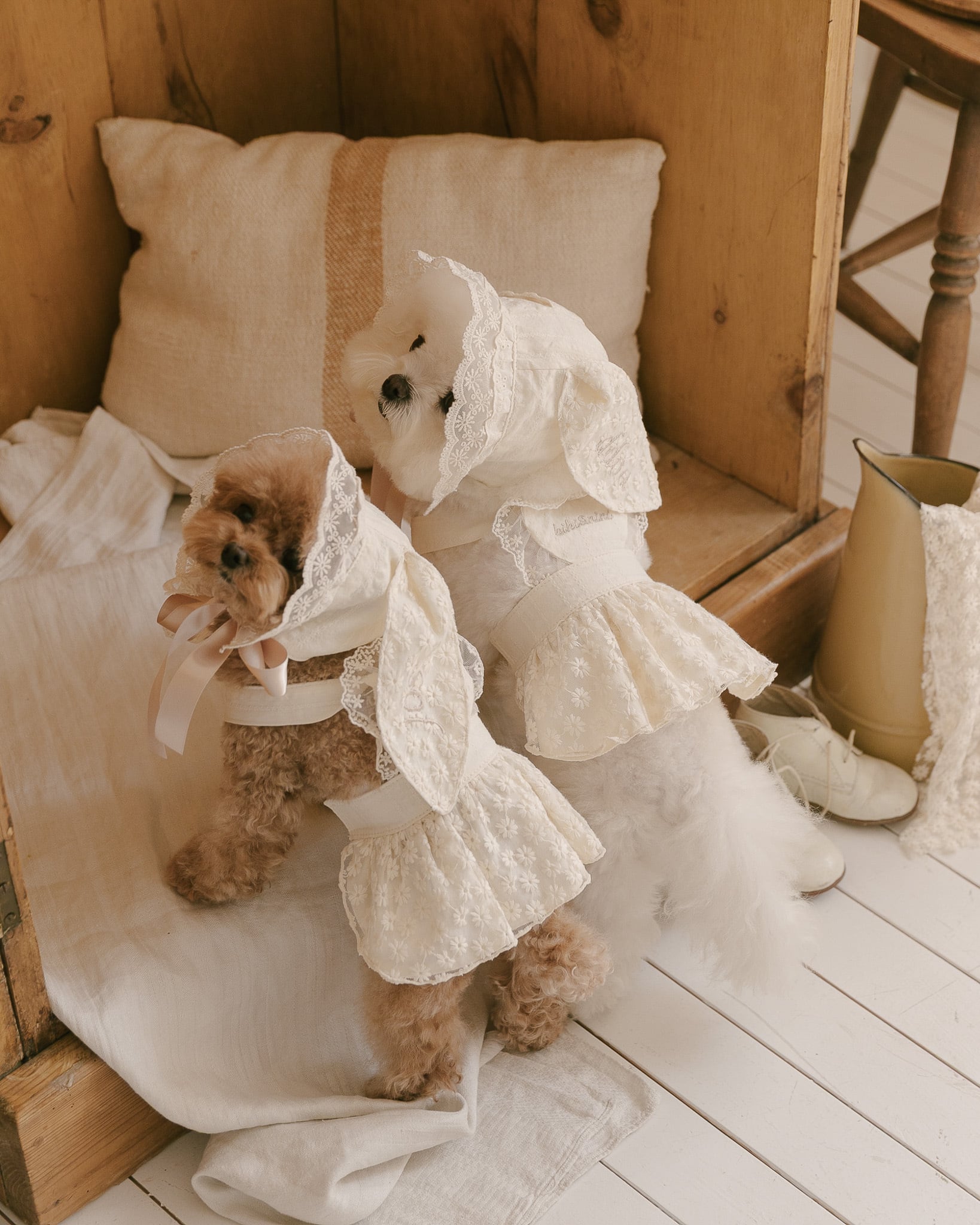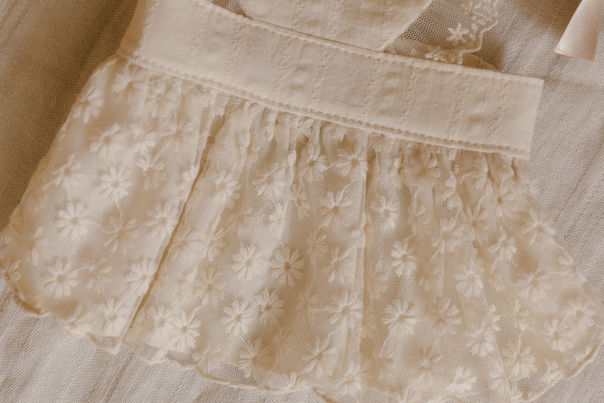 柔らかなアイボリーカラーに、可憐なデイジーの花を刺繍したレース生地を重ねることで、ヴィンテージ感あふれる愛らしい雰囲気を演出しました。