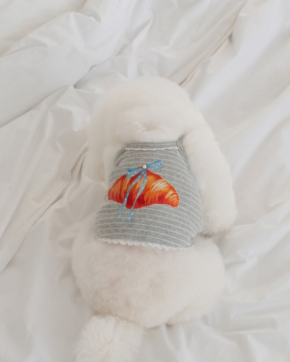 - リアルなクロワッサングラフィックの上に空色のドットリボンが加わり、童話のようなムード