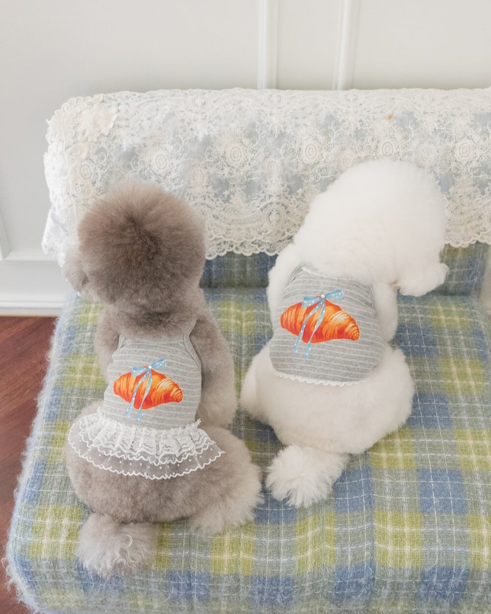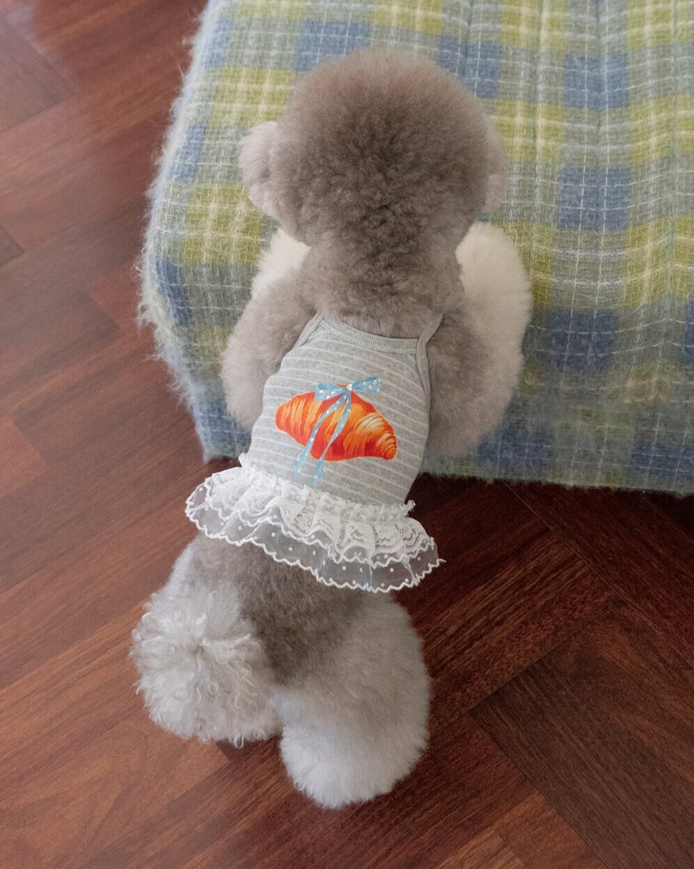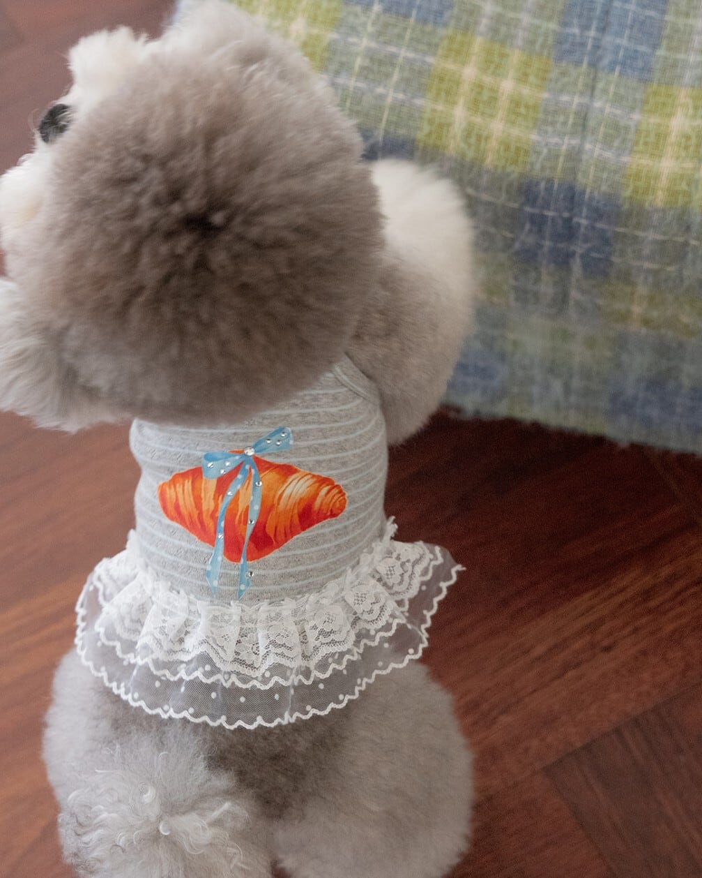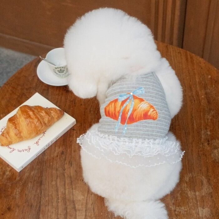 - リアルなクロワッサングラフィックの上に空色のドットリボンが加わり、童話のようなムード