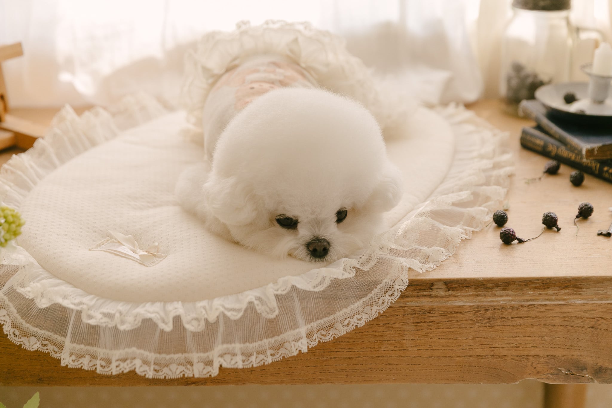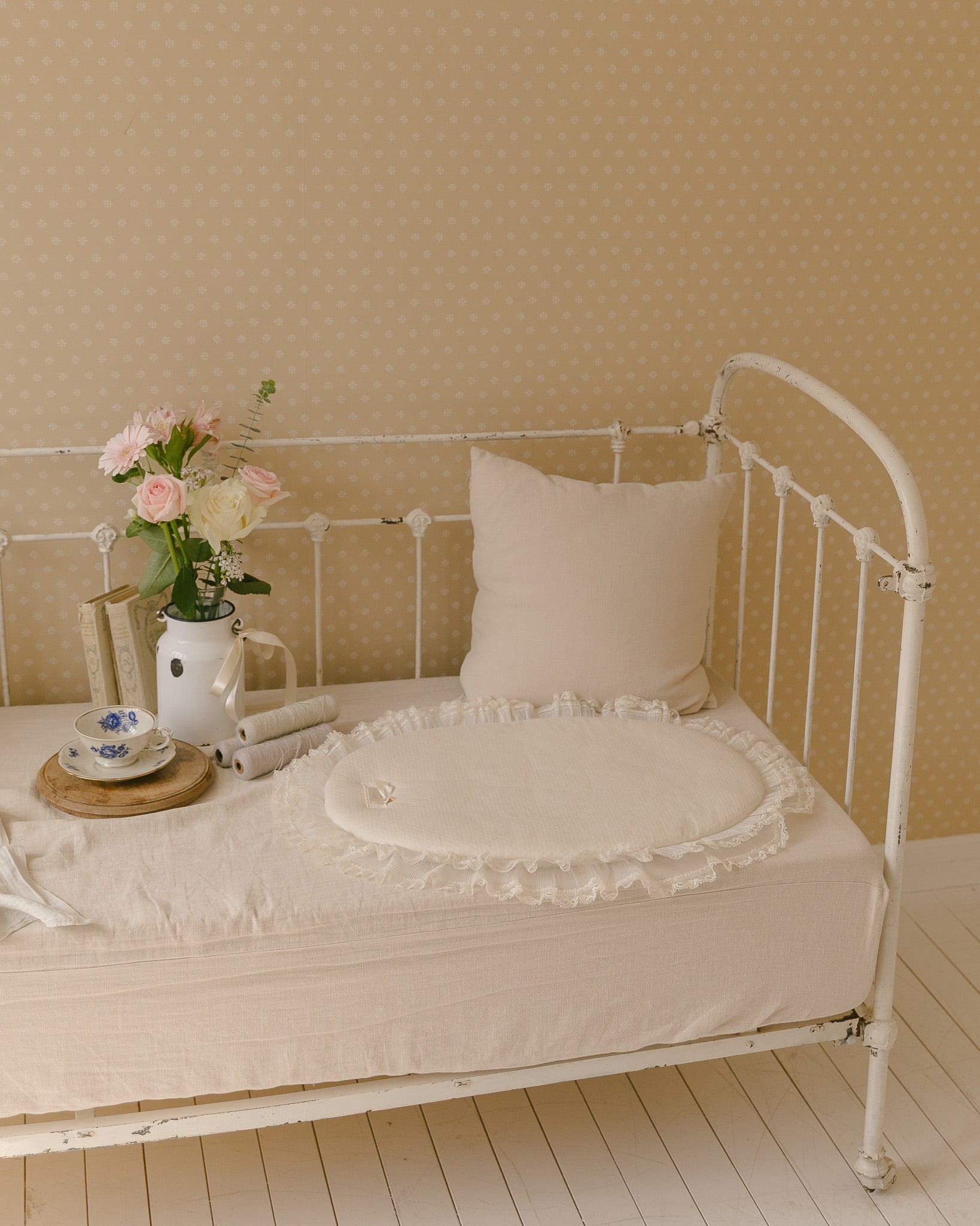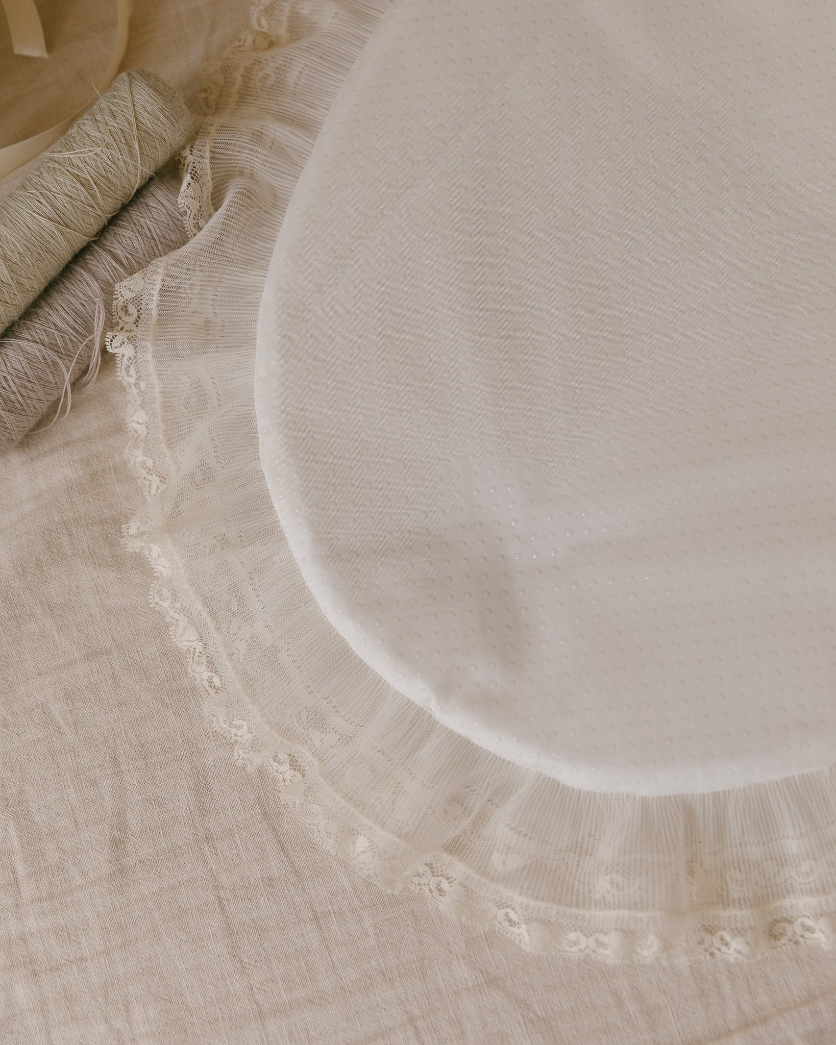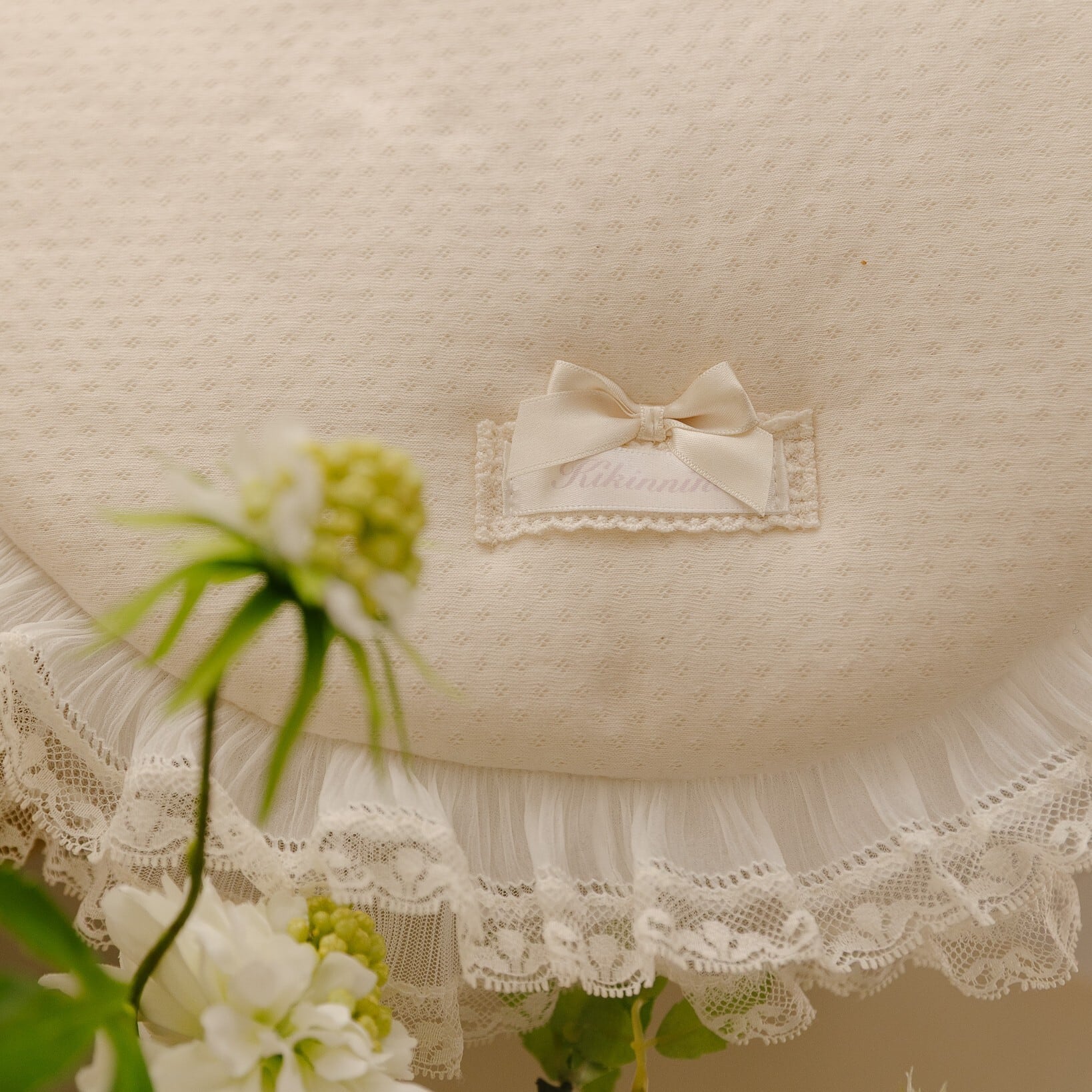 繊細な織り目が美しく、愛らしい2段のレースフリルがセットで着用すると、